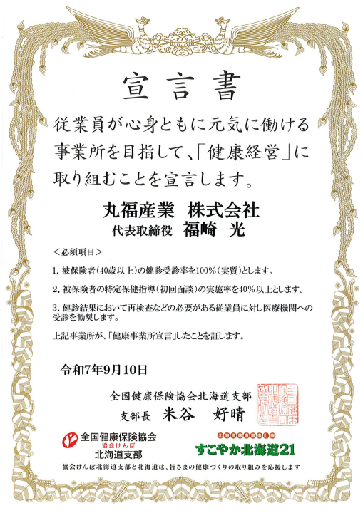 「健康事業所宣言」の認定を受けました 従業員が心身ともに元気に働ける職場を目指し「健康事業所宣言」を行い、健康経営に取り組む事業所として全国健康保険協会北海道支部より認定を頂きました。今後も健康で働きやすい職場を目指し、様々なことに取り組んでまいります。
